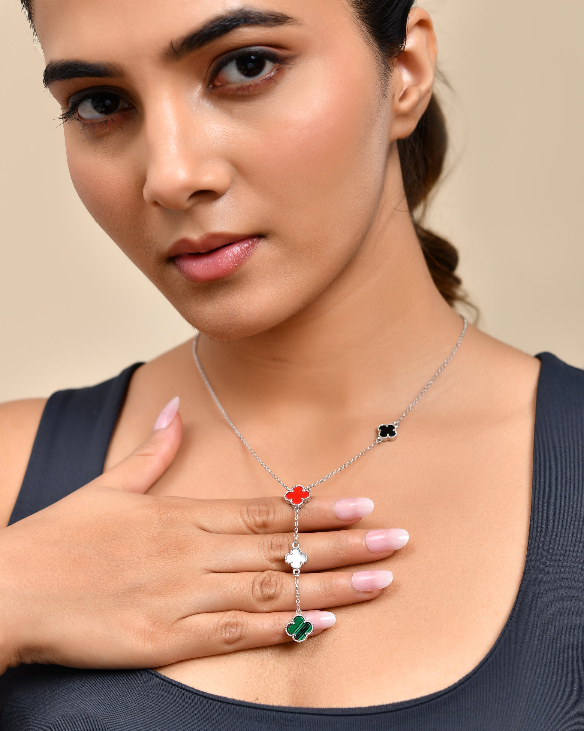 Crafted in sterling 92.5 silver, the 4 Leaf Spectrum Necklace features a distinct four-leaf design adorned with vibrant red, white, green, and black enamel accents. This elegant piece blends timeless silver craftsmanship with a colorful spectrum, making it a sophisticated accessory that complements both casual and formal attire.
