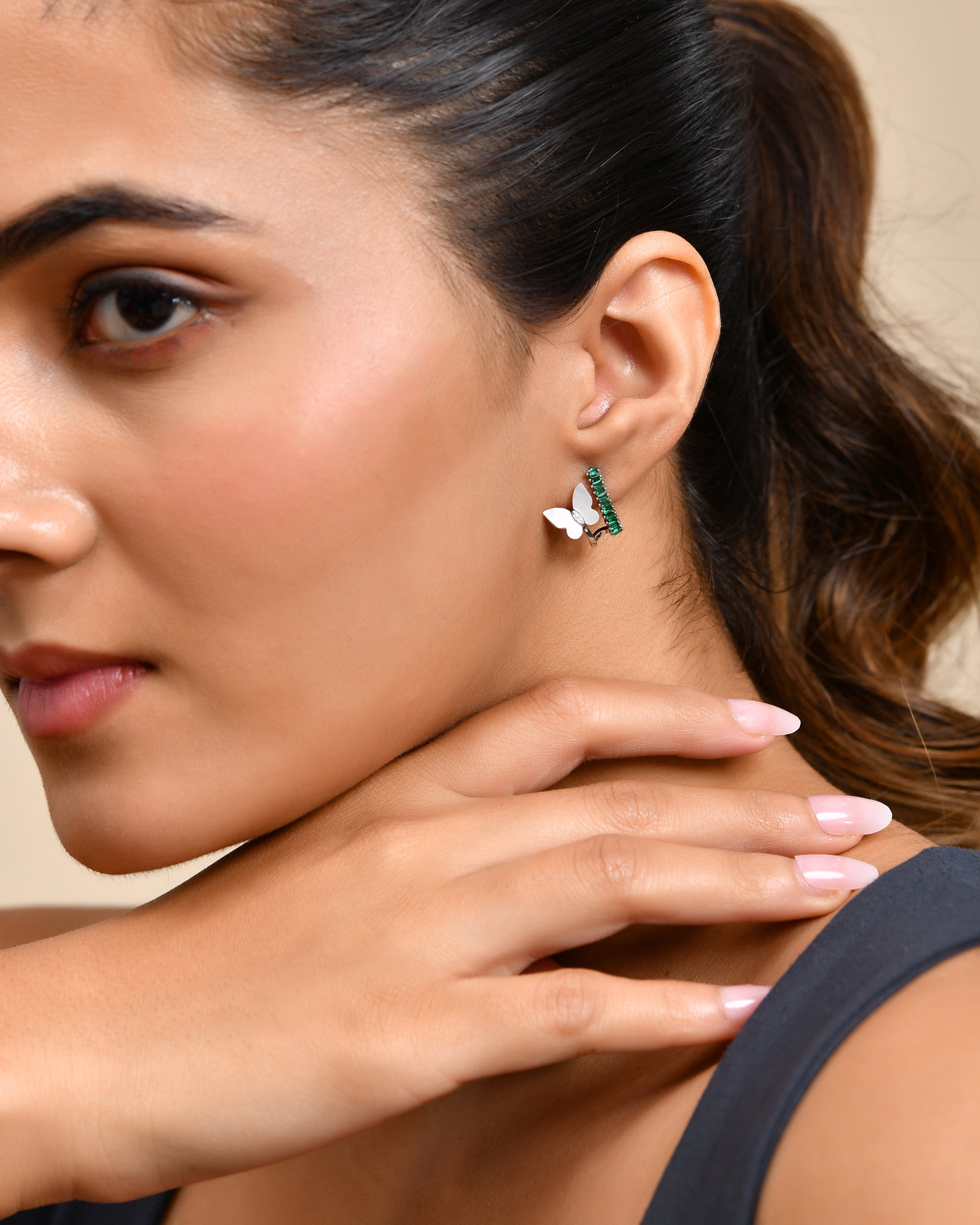 Crafted from 92.5 sterling silver, Pearl Flutter earrings feature delicate butterfly motifs adorned with lustrous pearls and vibrant green Swarovski stones. Designed for refined elegance, they add a subtle yet distinctive touch to any ensemble, combining classic materials with contemporary design for lasting appeal.