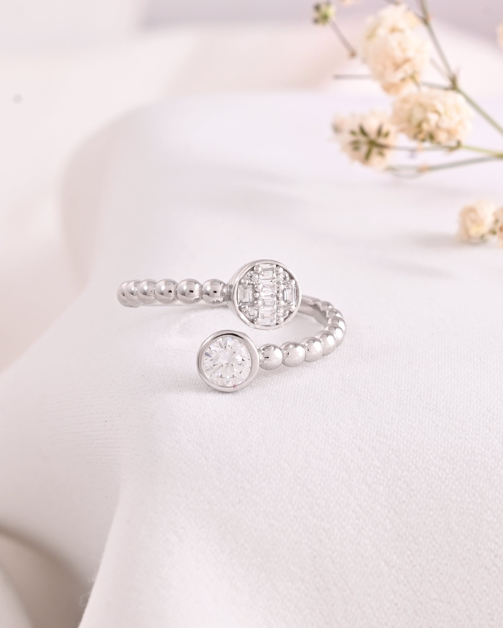 The Twin Glow Ring features two round Swarovski stones set in 92.5 sterling silver, offering both elegance and durability. Its adjustable band ensures a comfortable, personalized fit, making it a versatile addition to any jewelry collection.