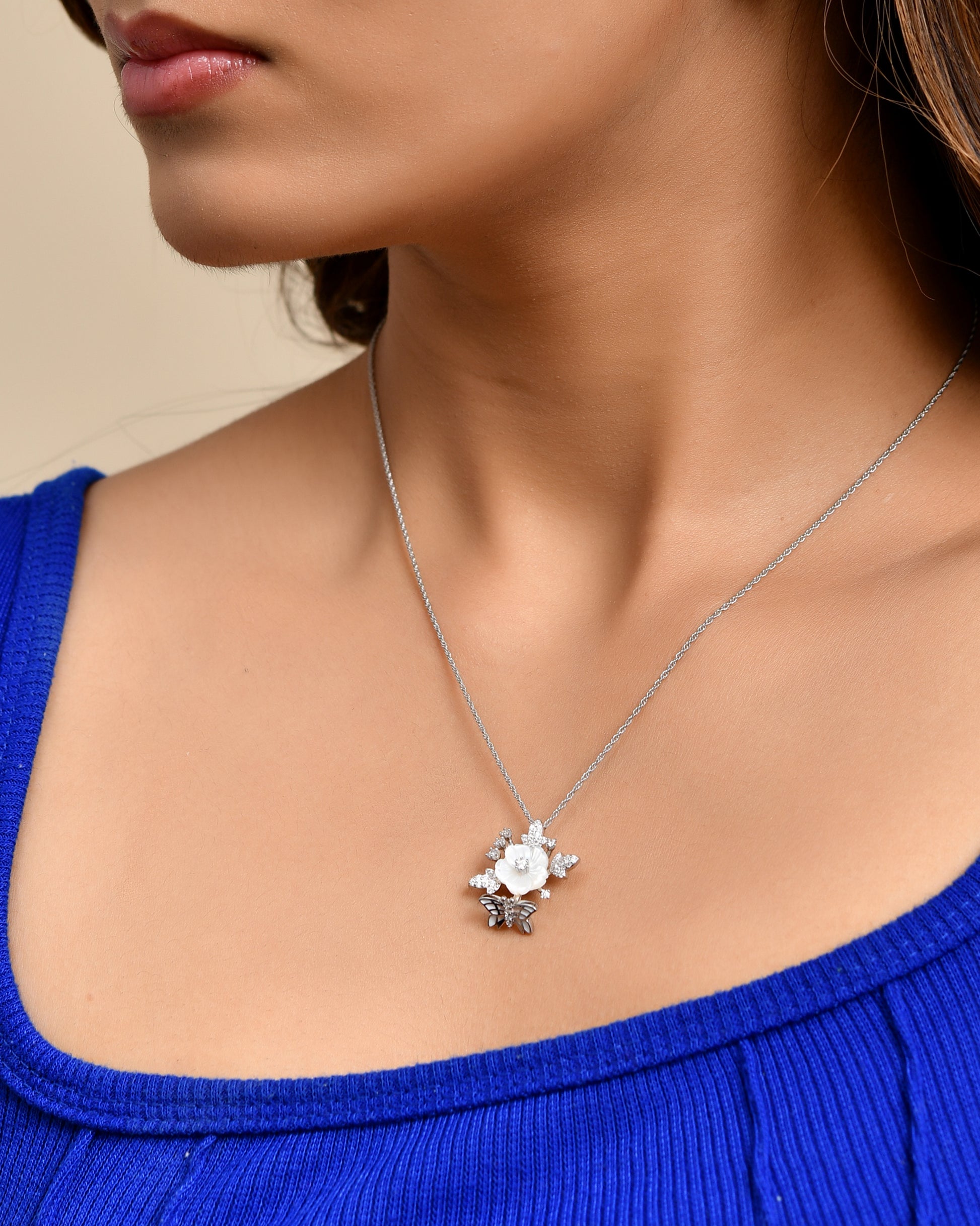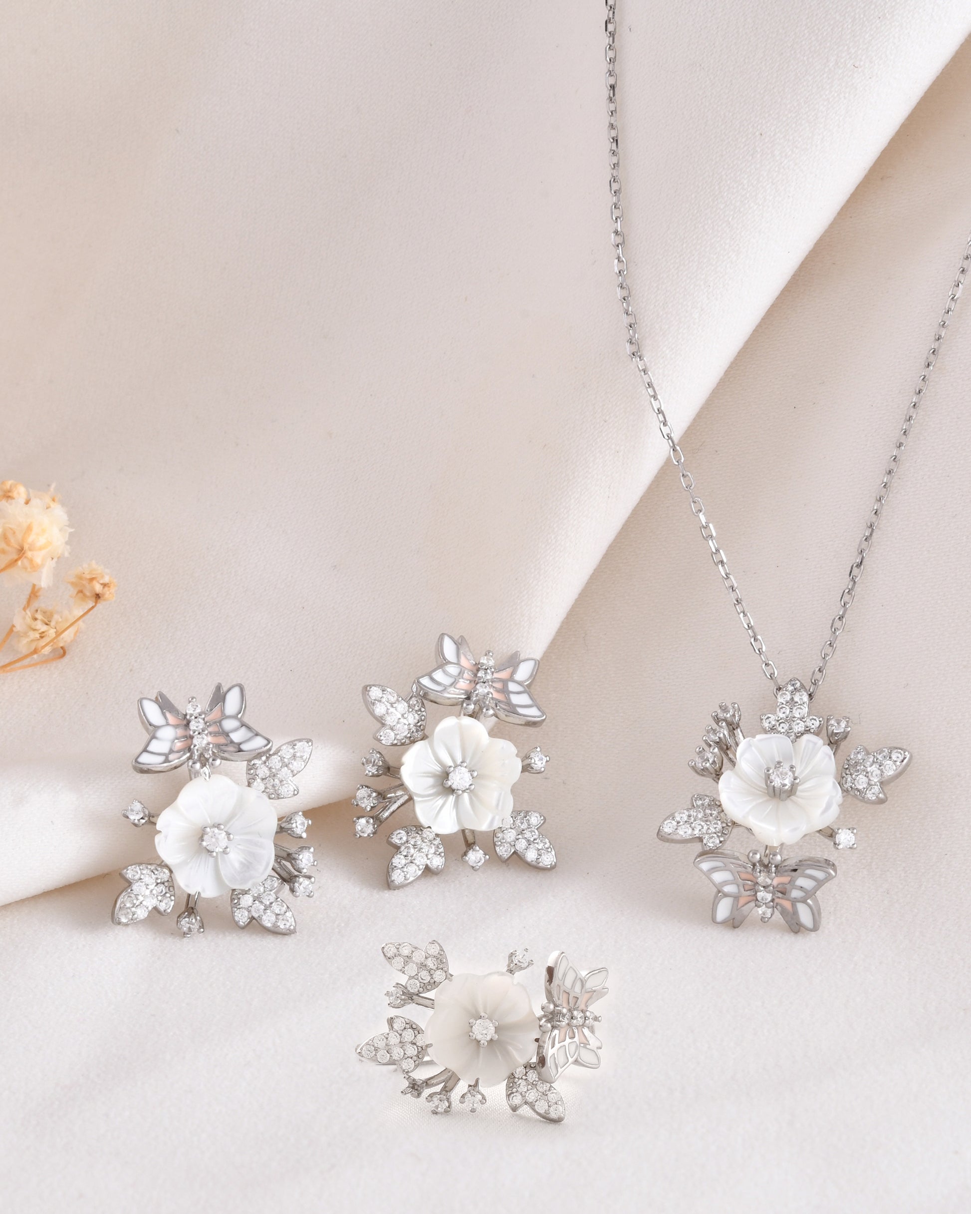 The Whispering Wings Set elegantly combines a pendant, earrings, and rings, each crafted from 92.5% silver and adorned with lustrous pearls and sparkling zircon accents. This delicate butterfly design showcases expert craftsmanship, offering a refined touch that enhances both casual and formal attire with understated sophistication.